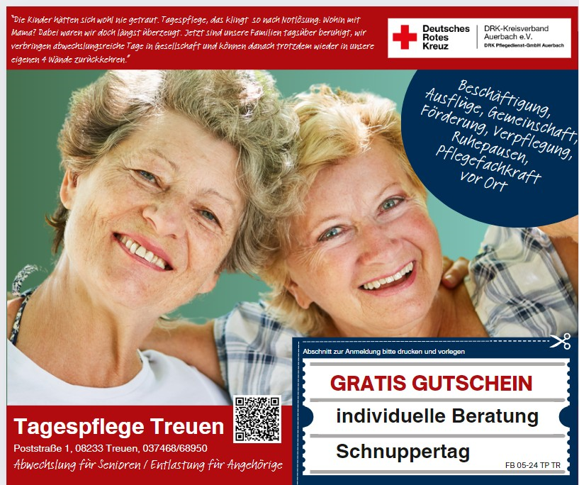 Die Tagespflege in Treuen verfügt über 12 Plätze. Neben der Tagespflege ist die Sozialstation als Einrichtung der ambulanten Krankenpflege im Hause tätig. Die gepflegte Grünanlage bzw. die Terasse bieten den Besuchern Erholung und Entspannung. Zur besseren Orientierung sind die Räume großzügig und hell gestaltet. Dazu gehören u.a. Küche, Aufenthaltsräume, ein Ruheraum und ein Pflegebad.
